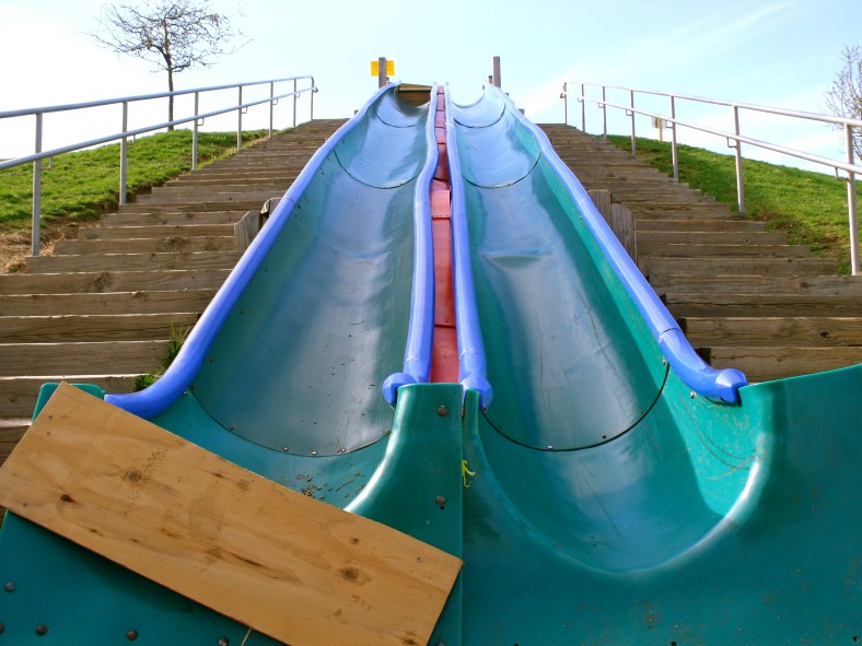 I remember when they were metal when I was little, and the slope was much more dramatic. My grandmother gave me wax paper to sit on, I was probably going close to 30 mph toward the bottom. It’s sad what that slide became, I can only imagine how much more the fun will be reduced with the new slide.