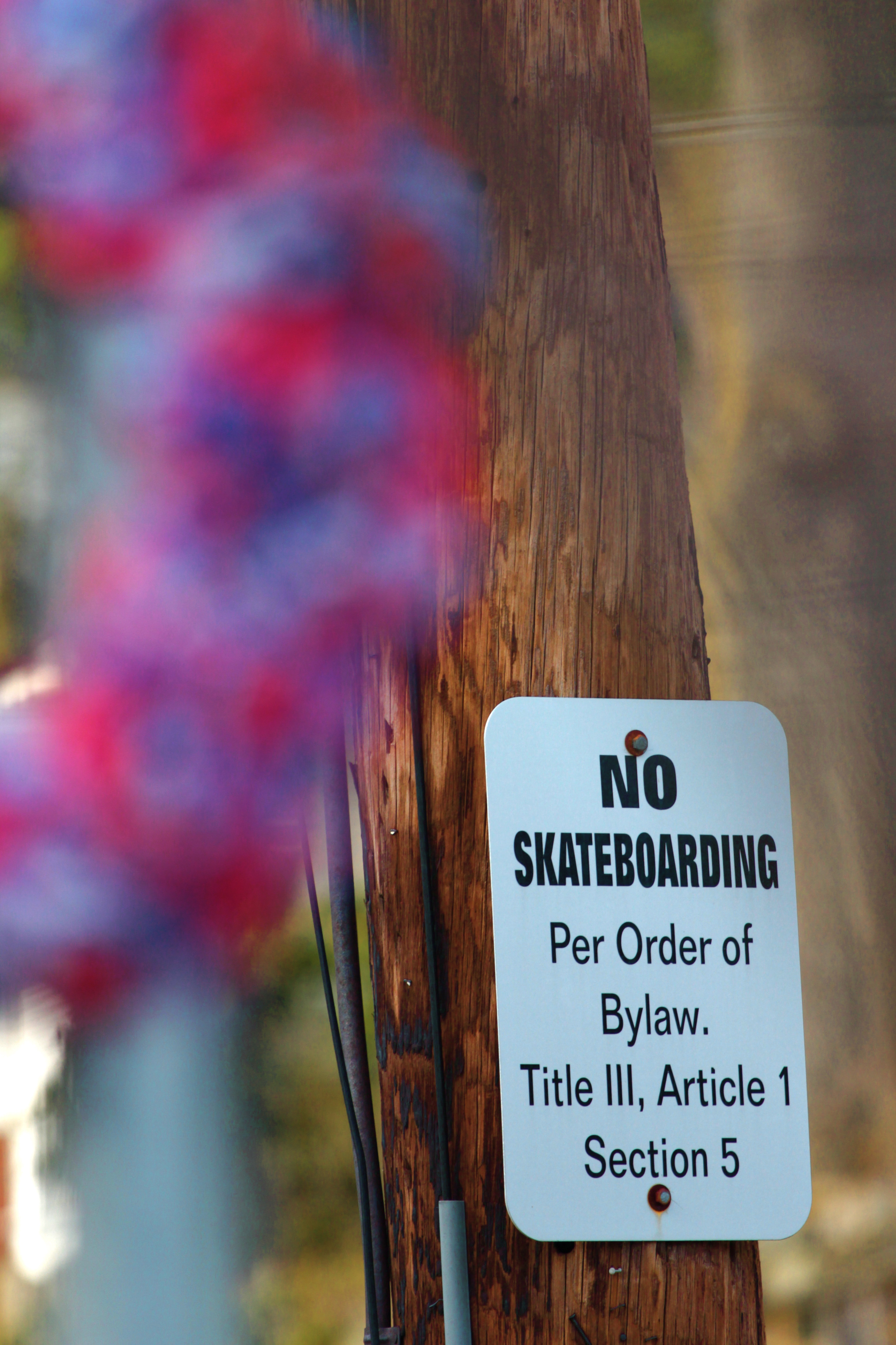 When trying to keep skateboarders out of a small park you could A) post a sign pointing the young, rebellious, would-be offenders to the skatepark down just down the street, or B) post a sign citing the bylaw so that they can look up the specific verbiage of said bylaw in their Town of Arlington bylaw pocket reference.