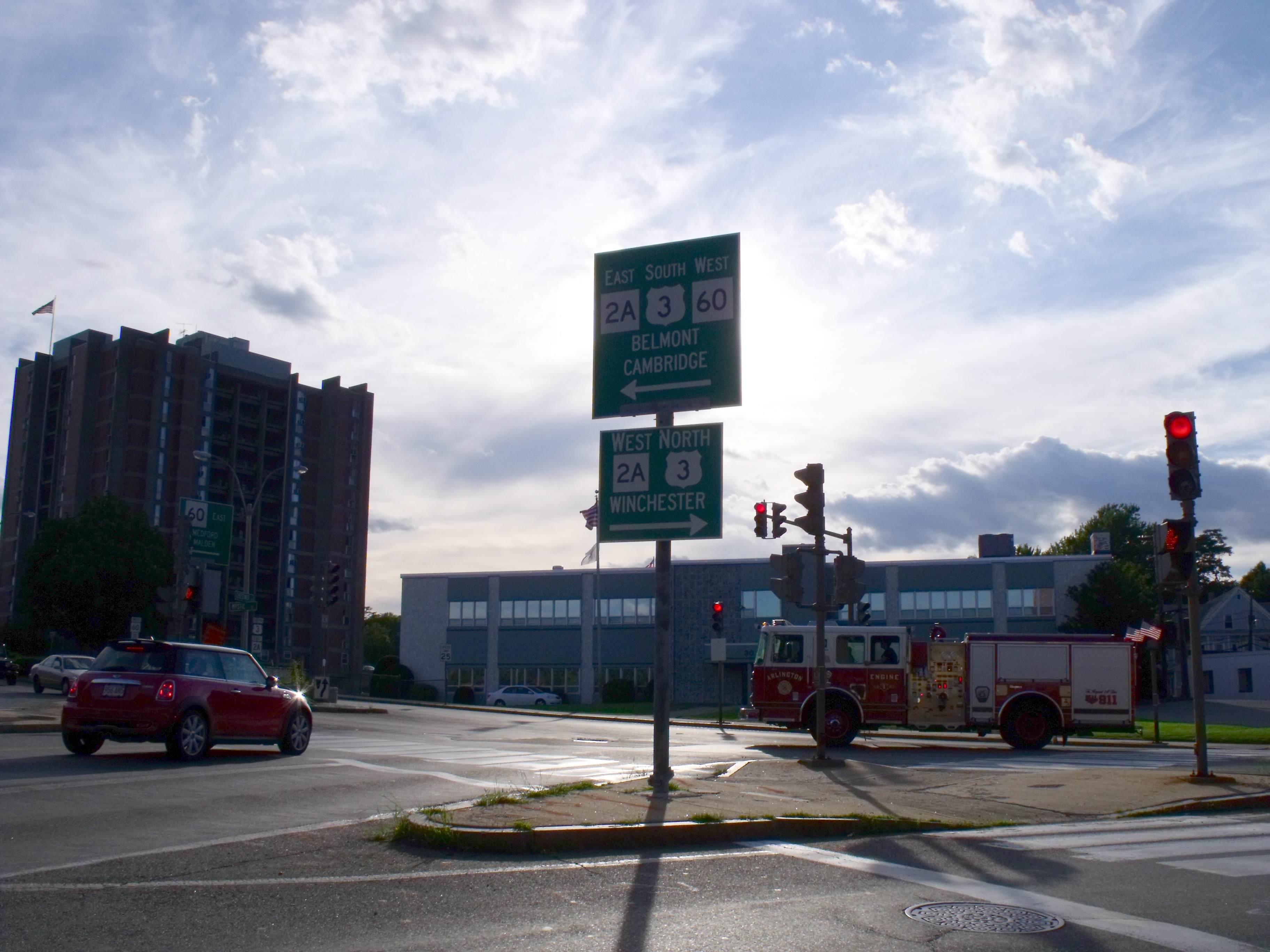 Arlington can be seen on the horizon from the tower in Mount Auburn Cemetery (Cambridge/Watertown.) On the left hill is the Park Avenue water tower and one can easily see the green water tower of Turkey Hill. At right, in the foreground, Bigelow Chapel is nestled in the trees of Mount Auburn Cemetery, and also to the right, almost at the edge of the frame, is the steeple of the Pleasant Street Congregational Church. April 22, 2010.