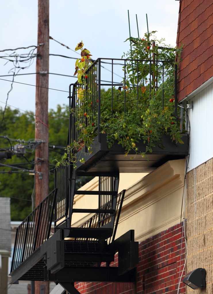 An elevator shaft rises from the former Symmes site in the morning sun. In this view down Hemlock Street, the silhouette of the Custom House Tower in Boston can also be seen. November