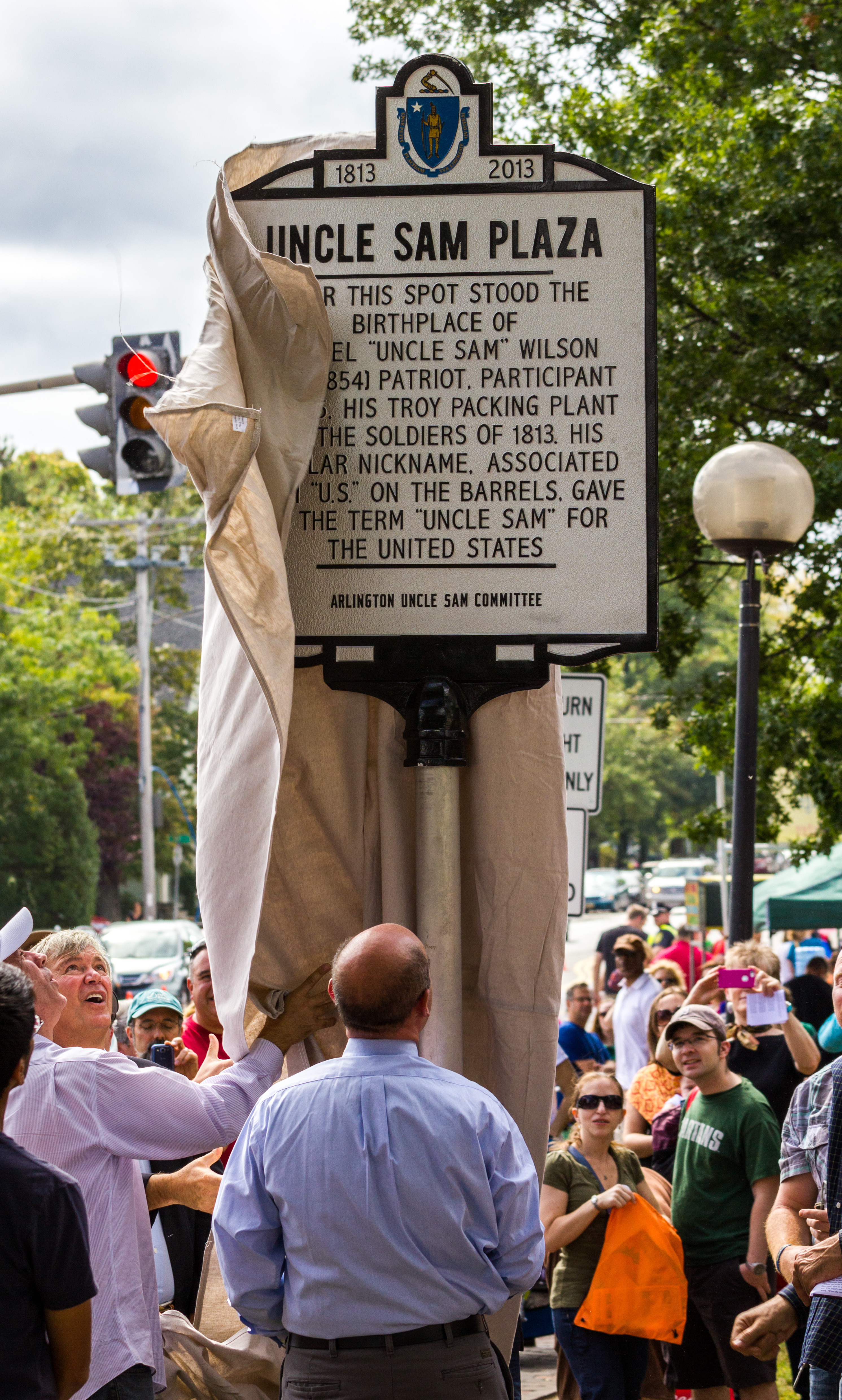 Selectman Joe Curro, foreground, looks up as a new sign is revealed marking Uncle Sam Plaza during Town Day festivities. Others in attendance included State Senator Ken Donnelly, State Representative Sean Garballey, and U.S. Representative candidates Middlesex Sheriff Peter Koutoujian, and State Senator Will Brownsberger.