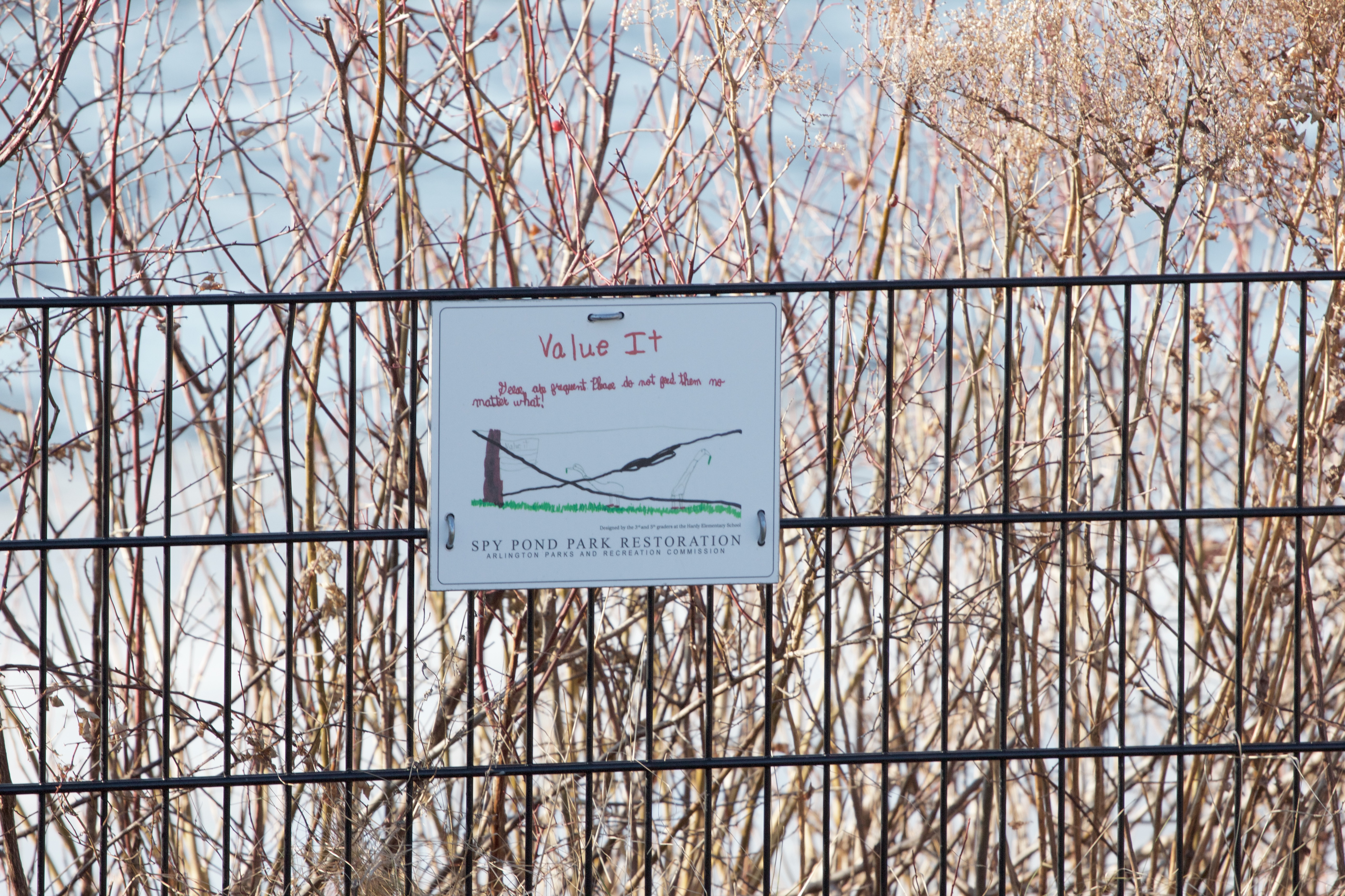 A map of the Arlington Reservoir, broken in the middle, at the head of the trail along Lowell Street. March 13, 2012.