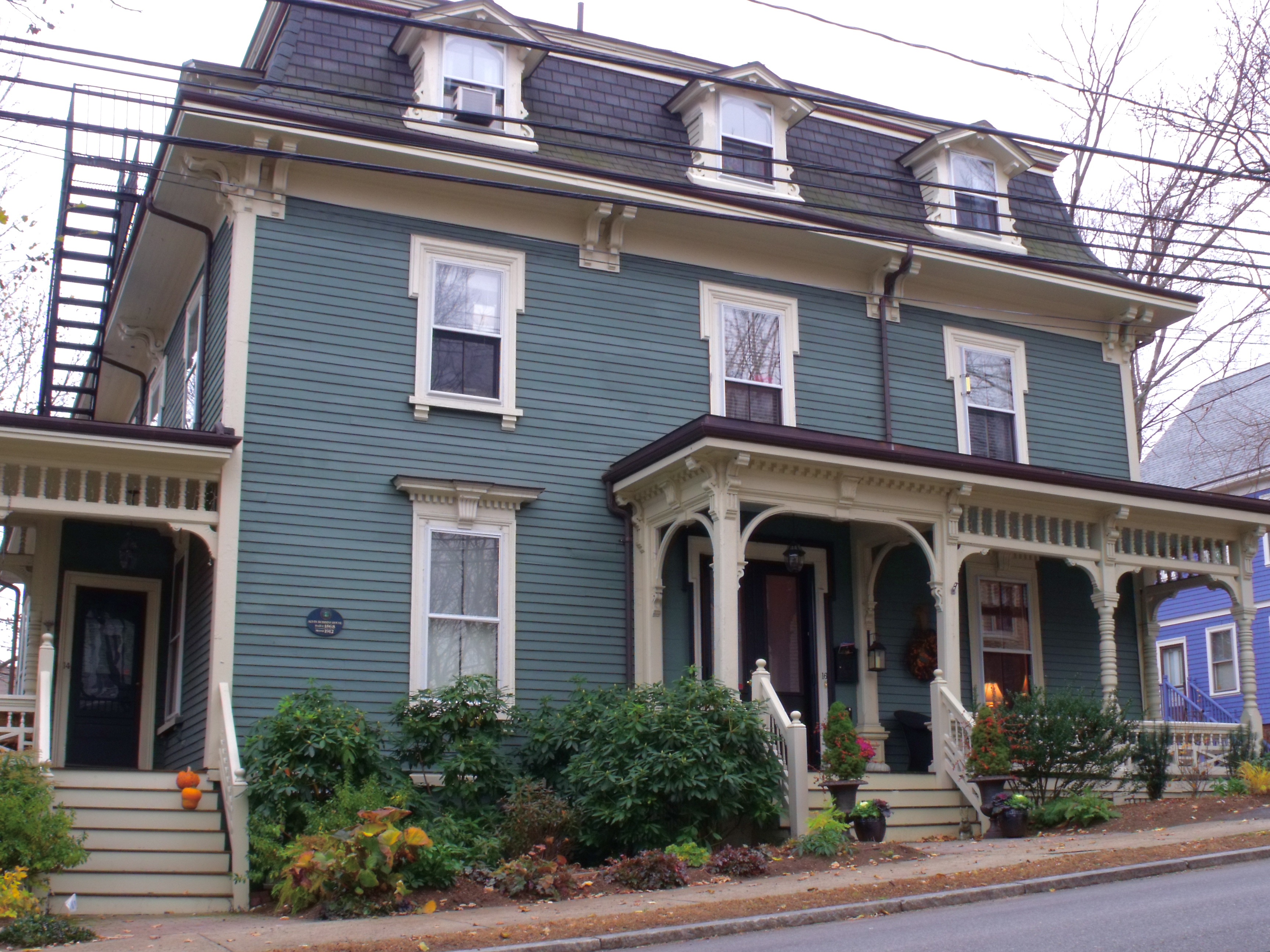The front porch of the hedge-surrounded Pliny B. Fiske House (1894) on Prescott Street. November 15, 2010.