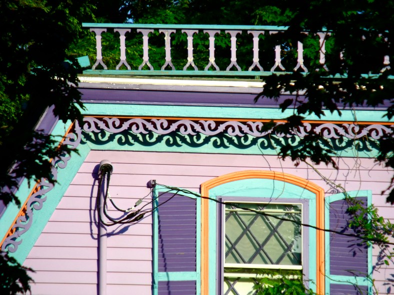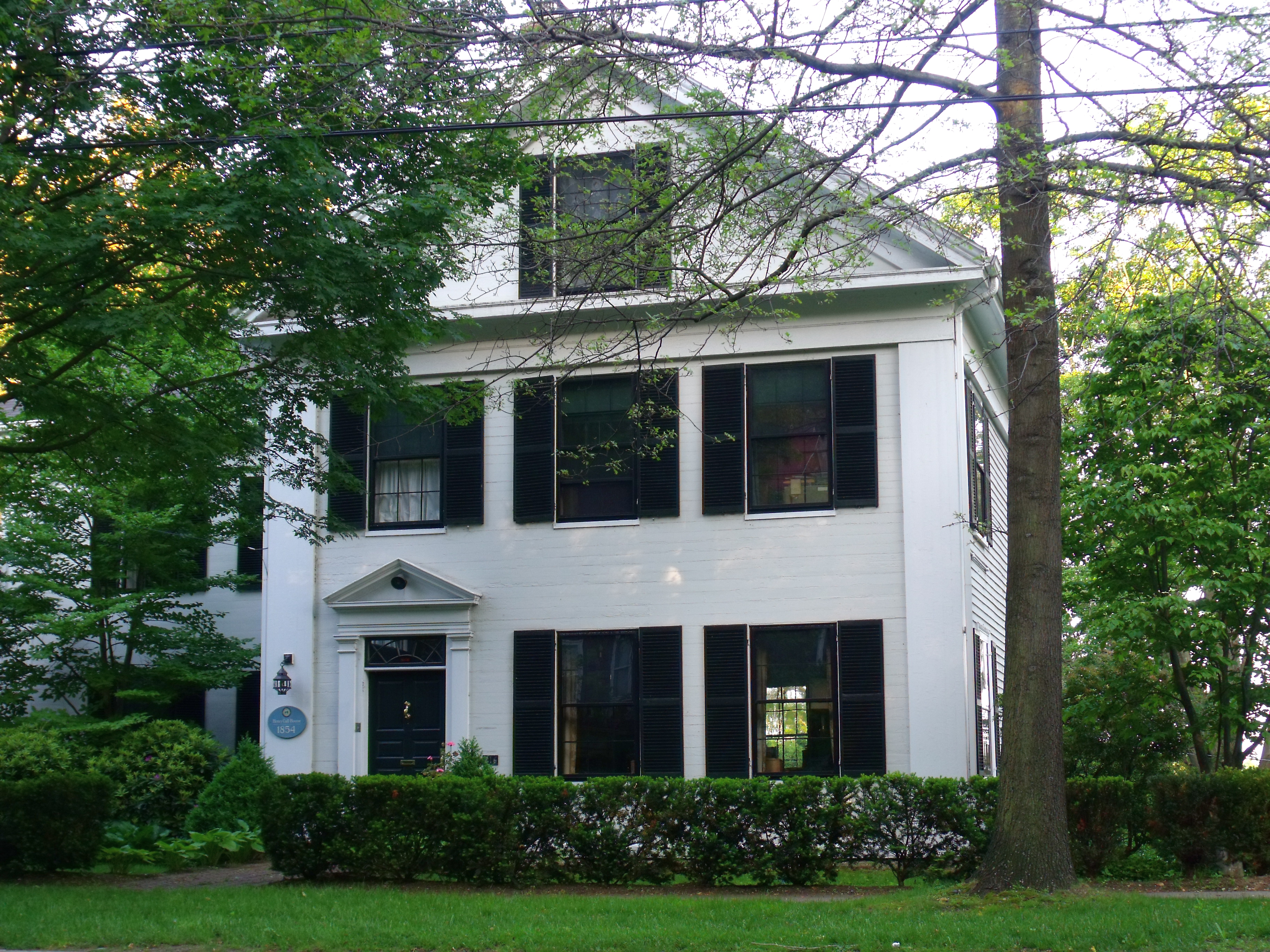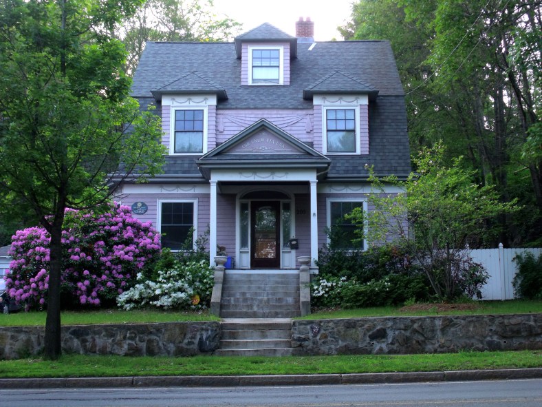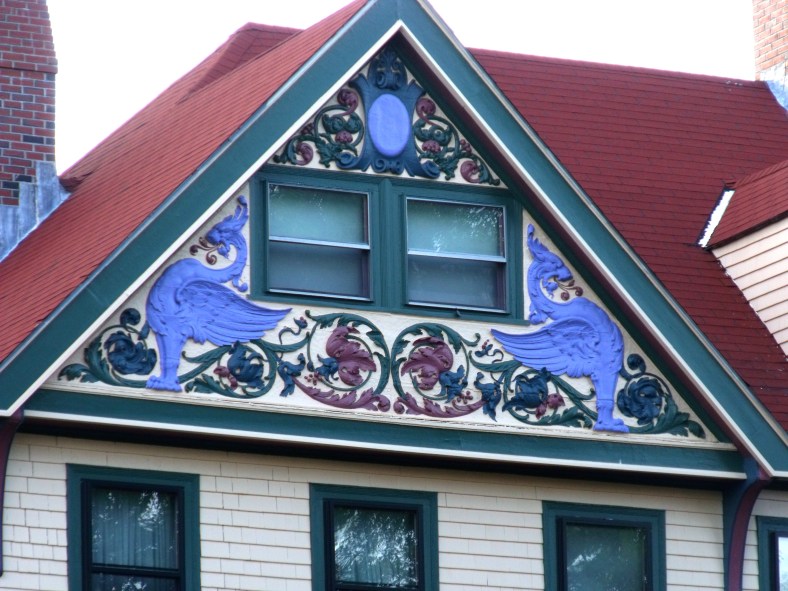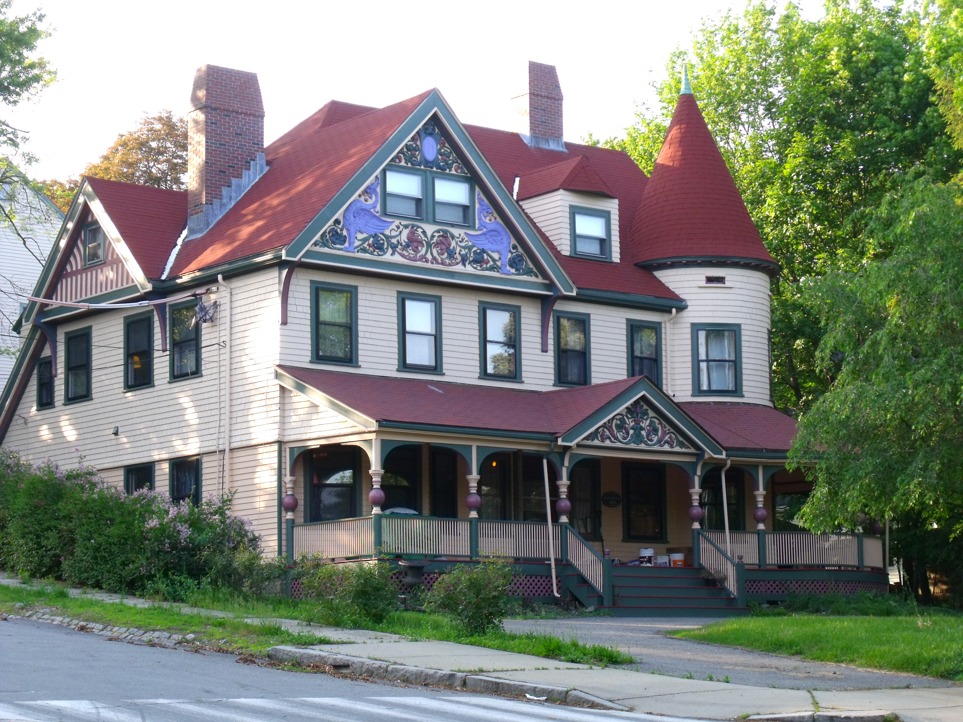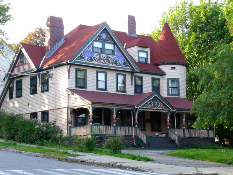 The Mabelle W. Hudson House (1900) on Pleasant Street. The latin text on the pediment reads "Cor Unum Via Una" or "One Heart, One Way." May 29, 2011.