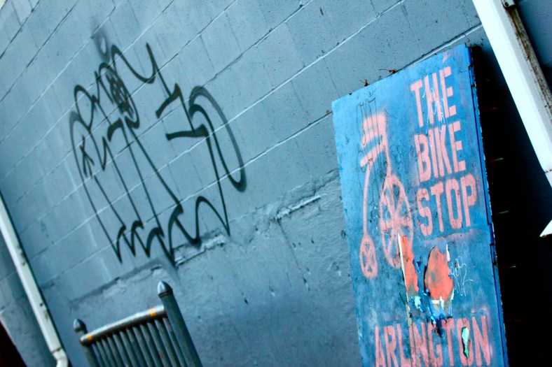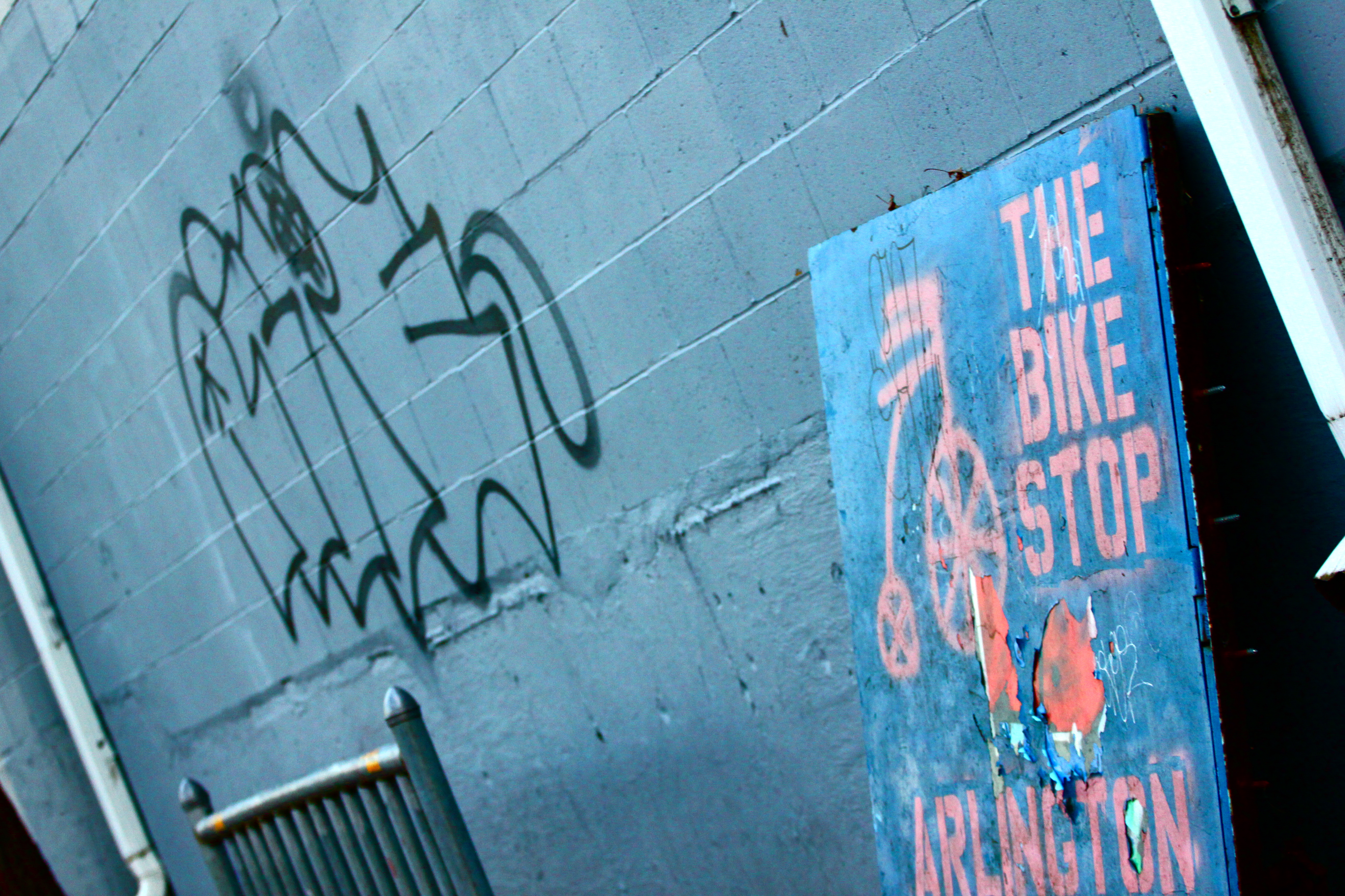 Once adorned with a colorful mural, the back wall of The Bike Stop on the MInuteman Bikeway is coated in a drab gray that has made it a target for tagging. February 1, 2012.