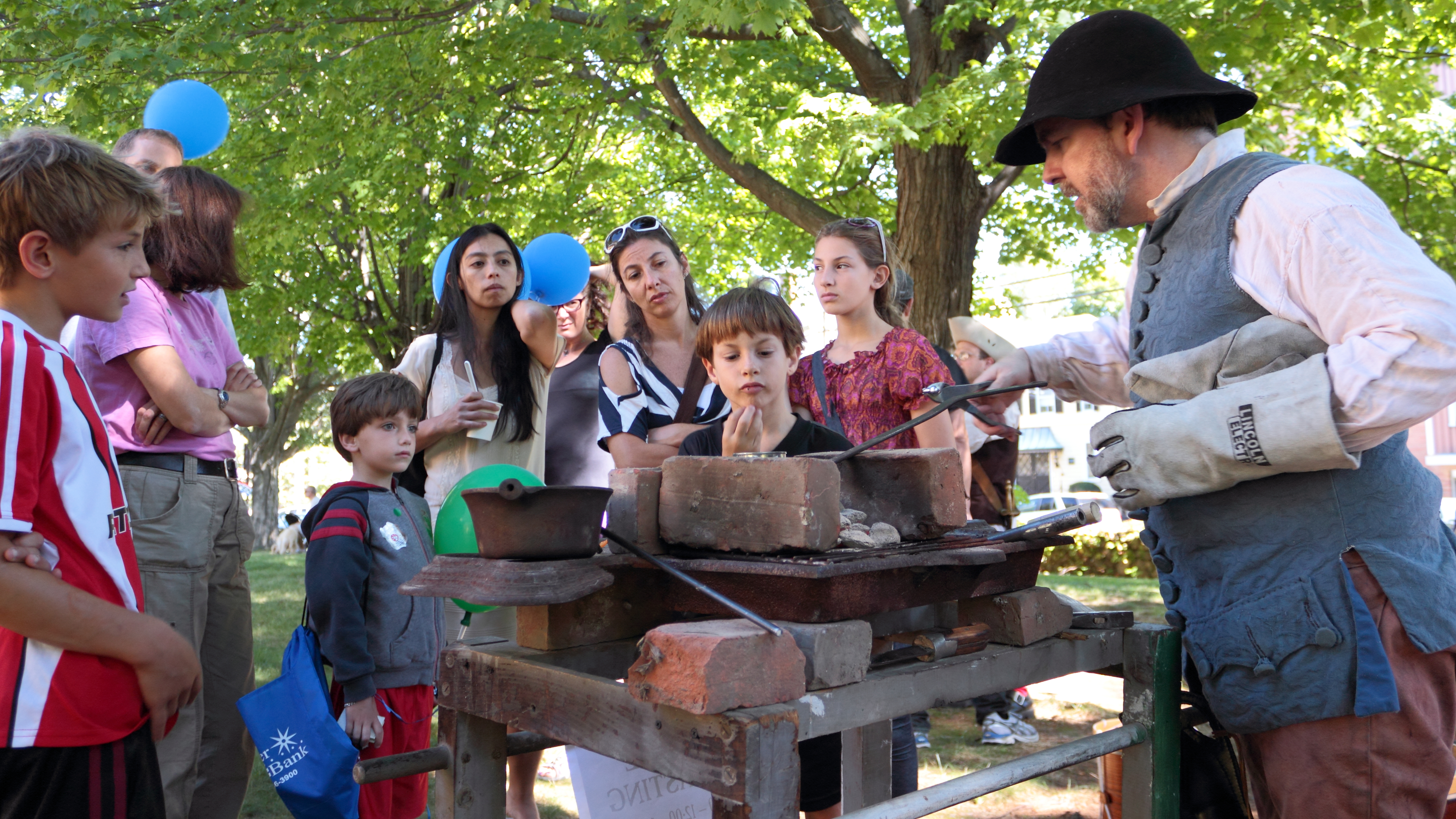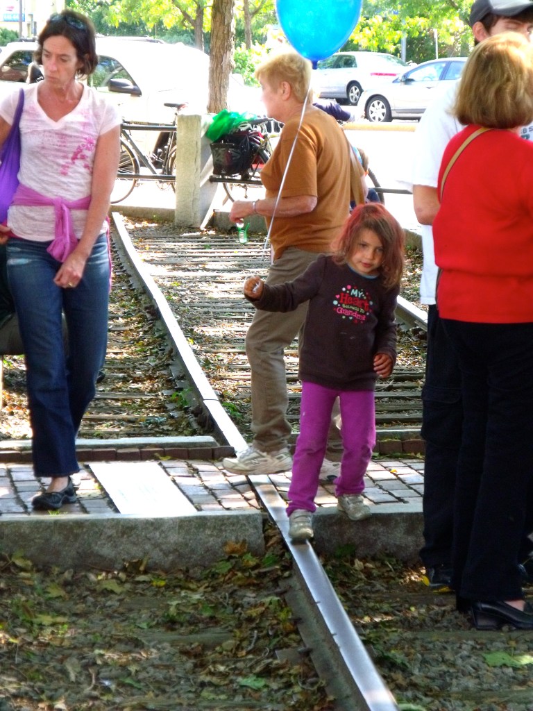 Selectman Joe Curro, foreground, looks up as a new sign is revealed marking Uncle Sam Plaza during Town Day festivities. Others in attendance included State Senator Ken Donnelly, State Representative Sean Garballey, and U.S. Representative candidates Middlesex Sheriff Peter Koutoujian, and State Senator Will Brownsberger.