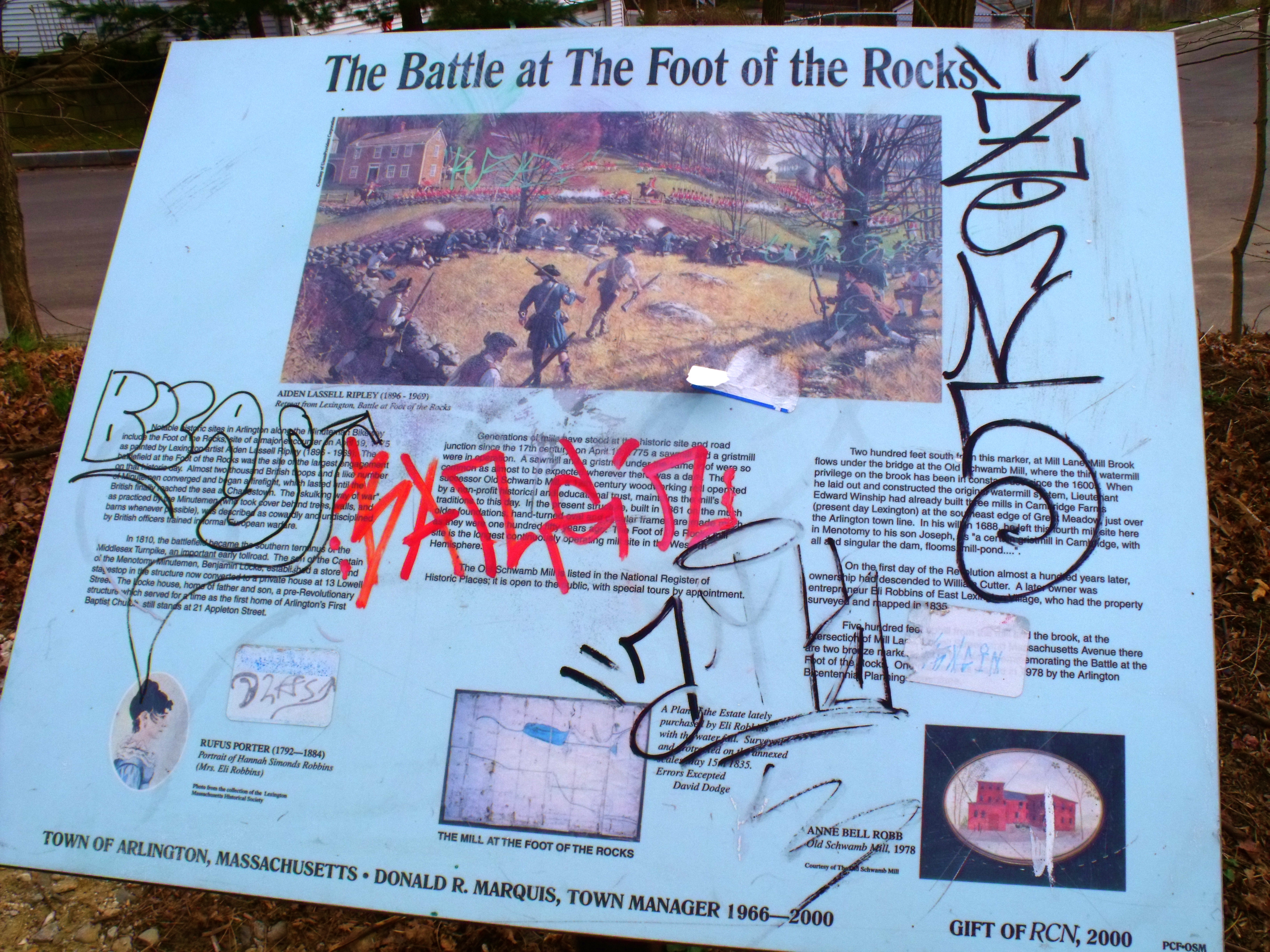 A plaque at Massachusetts Avenue and Lowell Street reminding passers by of the fighting on the first day of the American Revolution at the Foot of the Rocks. April 11, 2011.