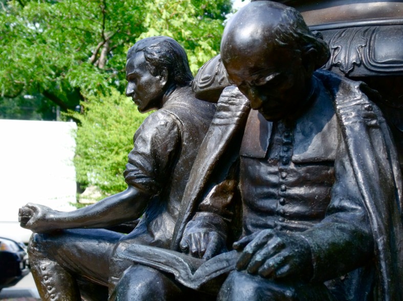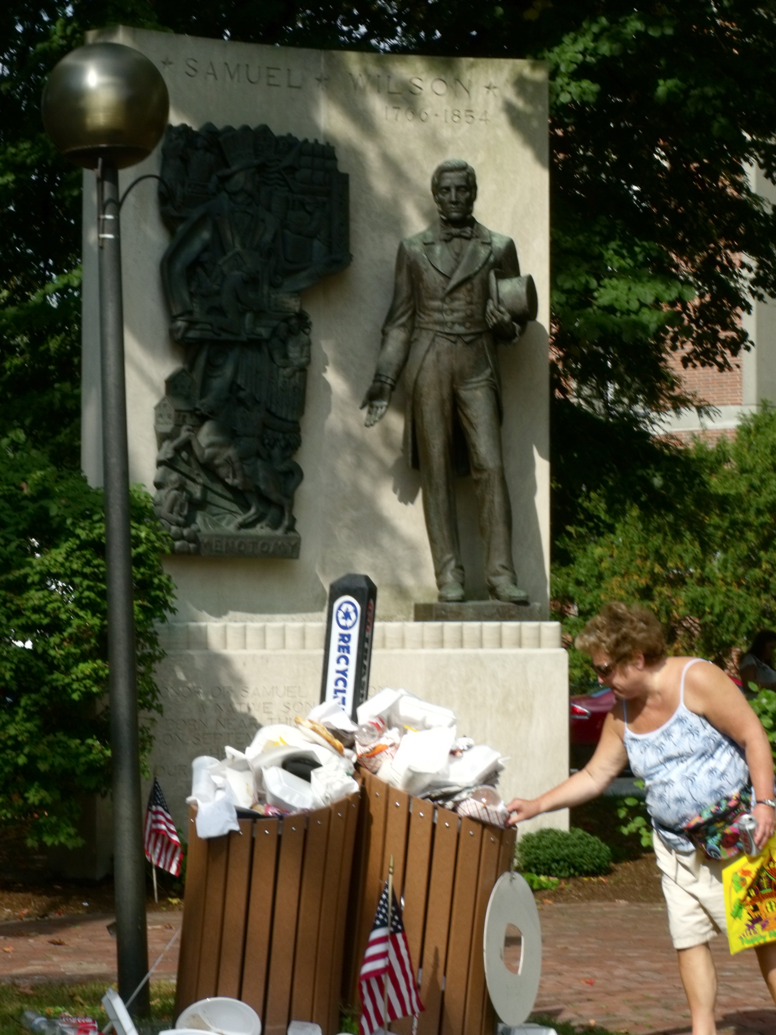 Pictured are a Minuteman and a Puritan Devine, two of the four figures sitting at the base of the Robbins Memorial Flagstaff sculpted by Cyrus E. Dallin. August 9, 2010.