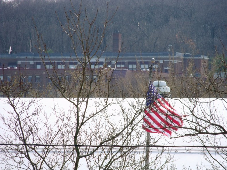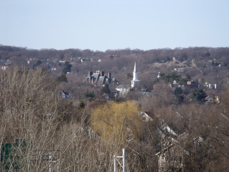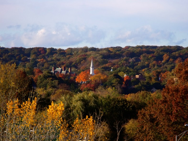 To the top right, one can see the rubble of the Symmes site. At the top middle, the building just barely peeking above the tree line, with the three white dots on top is the Stratton School. In the center, the gabled roof of Arlington Senior Center and the white steeple of the Park Avenue Congregational Church can be seen. At the middle right, three of the four white chimneys and cupola of the Whittemore-Robbins House is visible. And to the left of that, there is the blue-domed steeple of the Highrock Church.