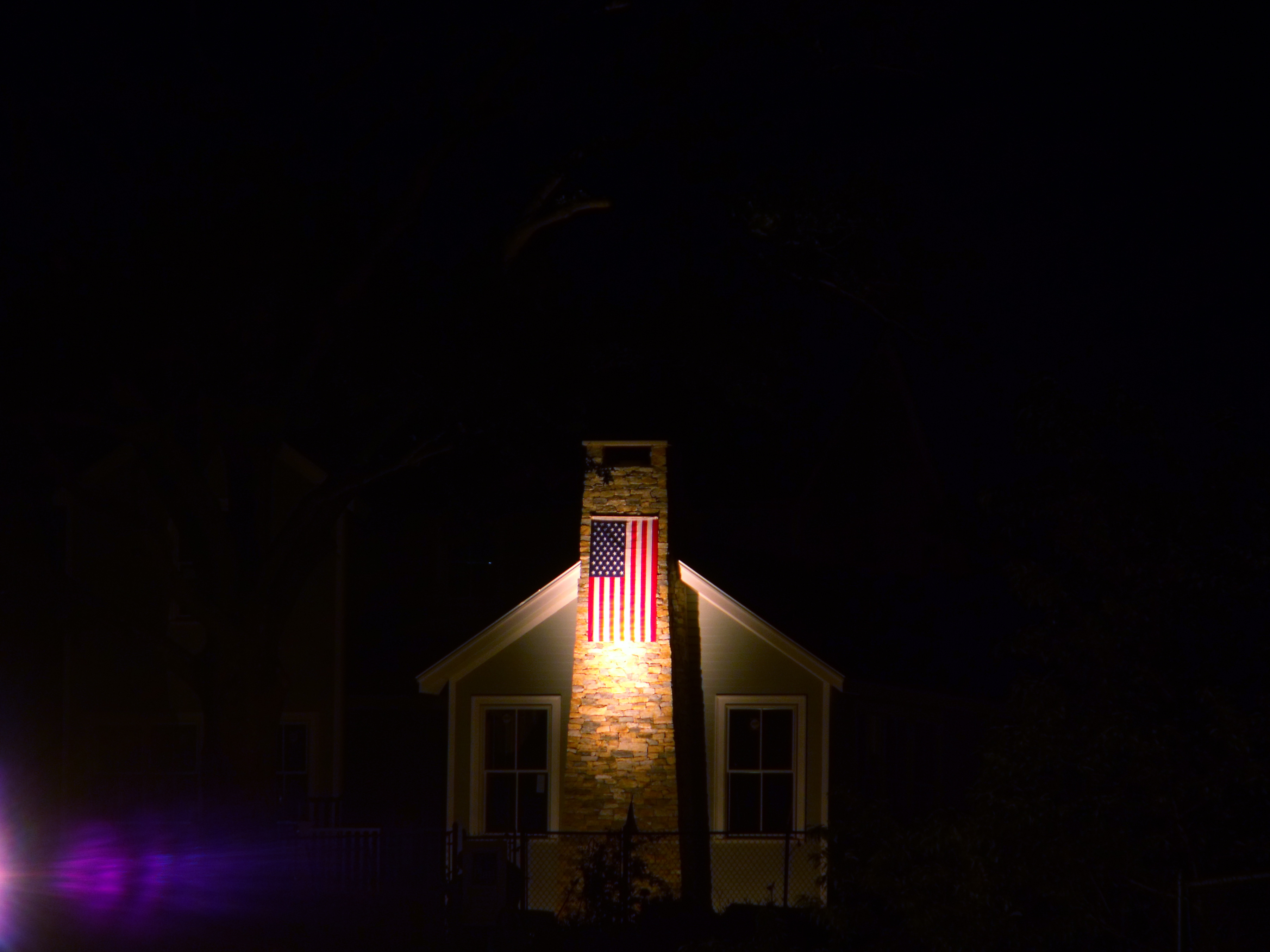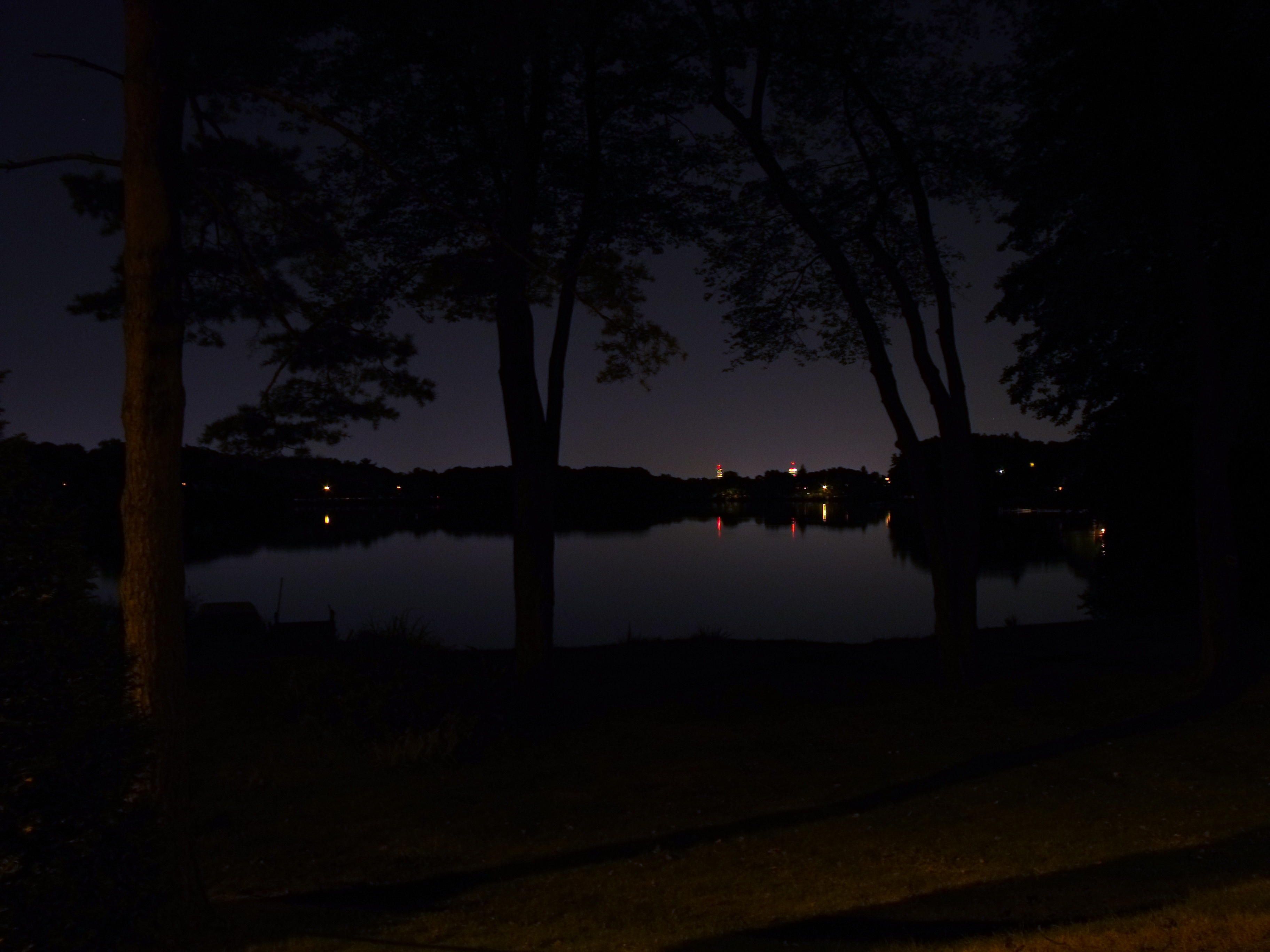 The Bunker Hill monument, perfectly framed by the trees, taken looking east-southeast on Gray Street near its intersection with Bartlett Avenue. This view, easily seen while driving at night, is reminiscent of the seal of Arlington. July 10, 2011.