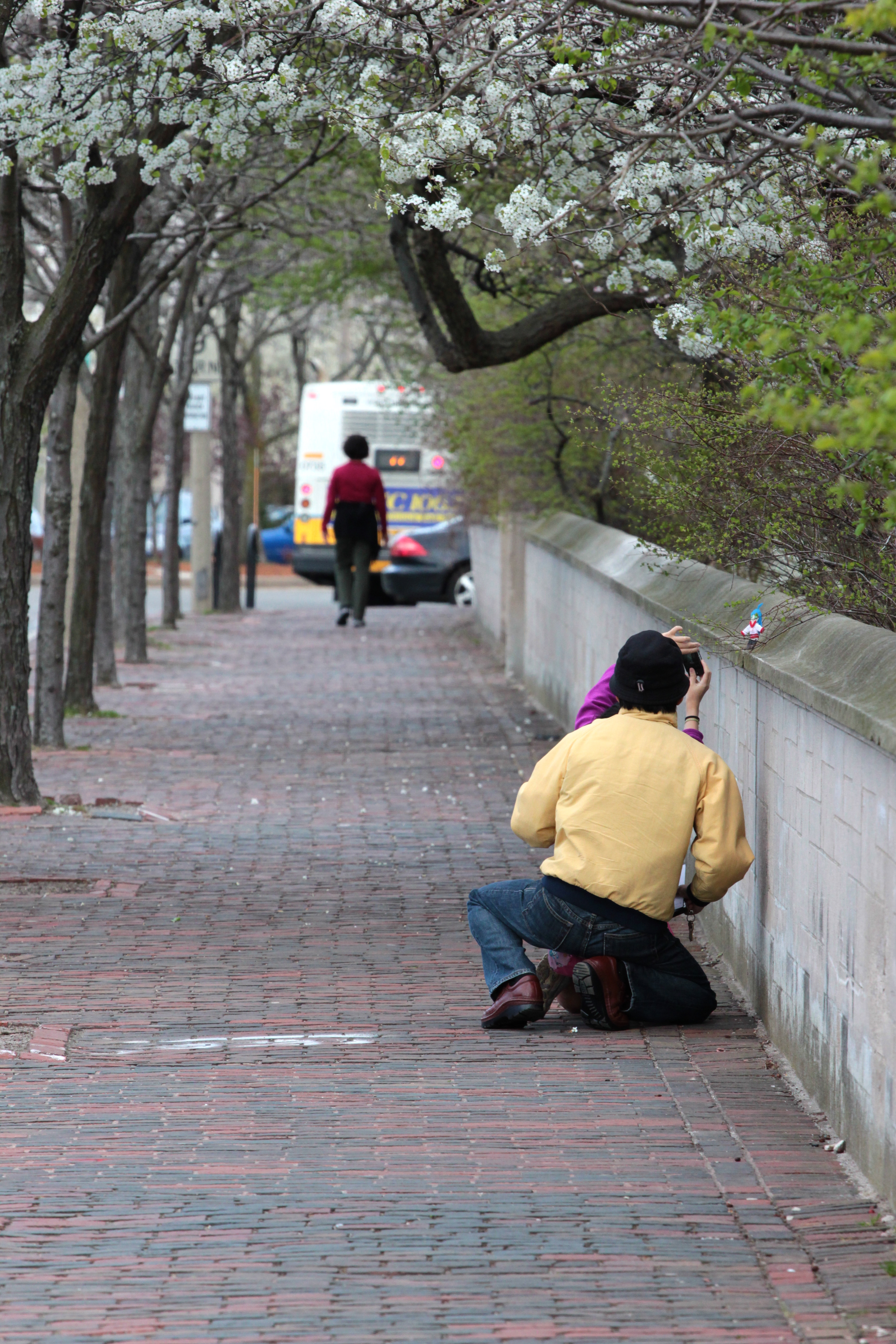 Elisabeth, a gardener at the Robbins Farm Garden, uses string to plot out rows for the planting of mustard and other spicy greens. April 14, 2012.