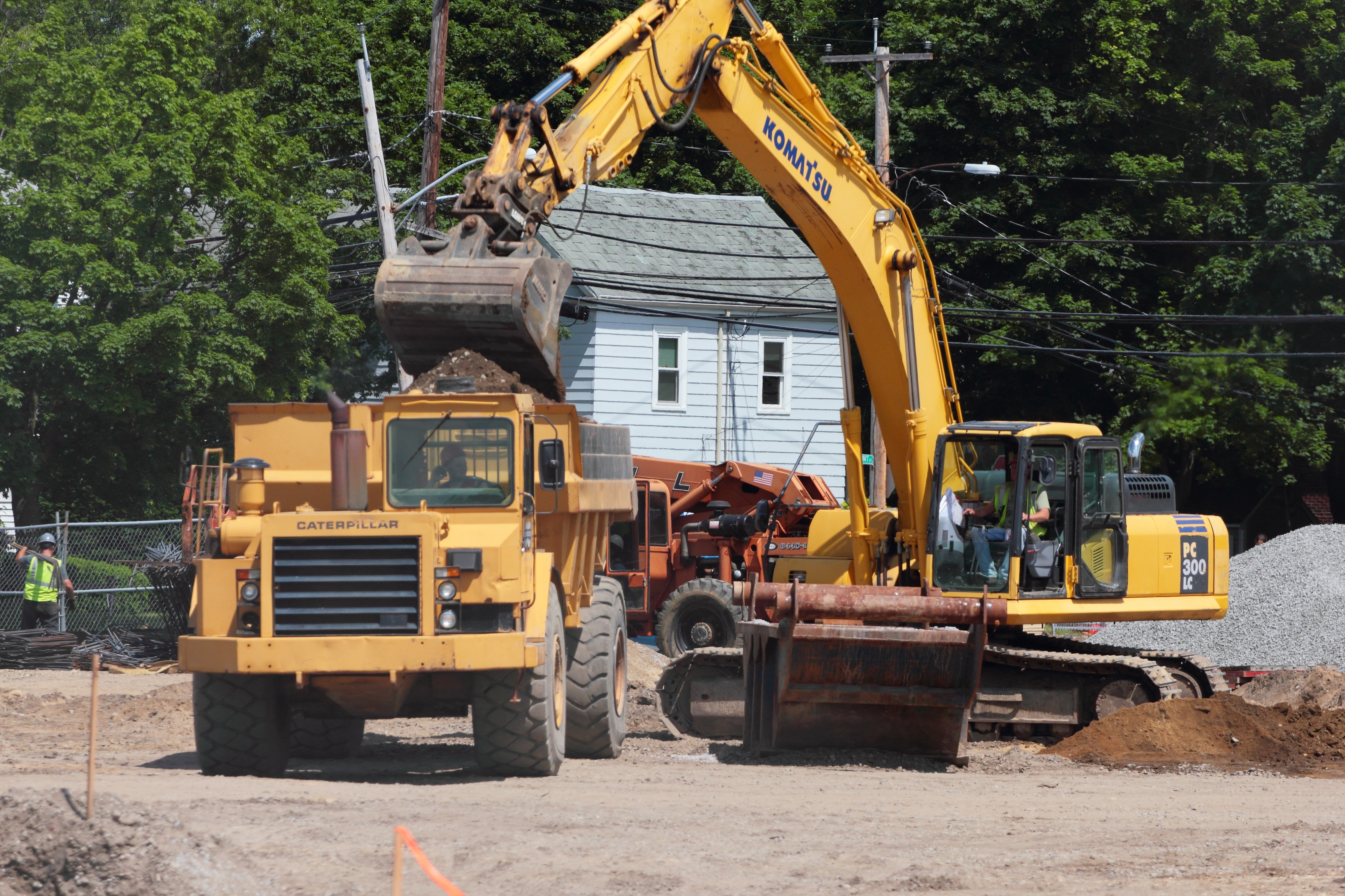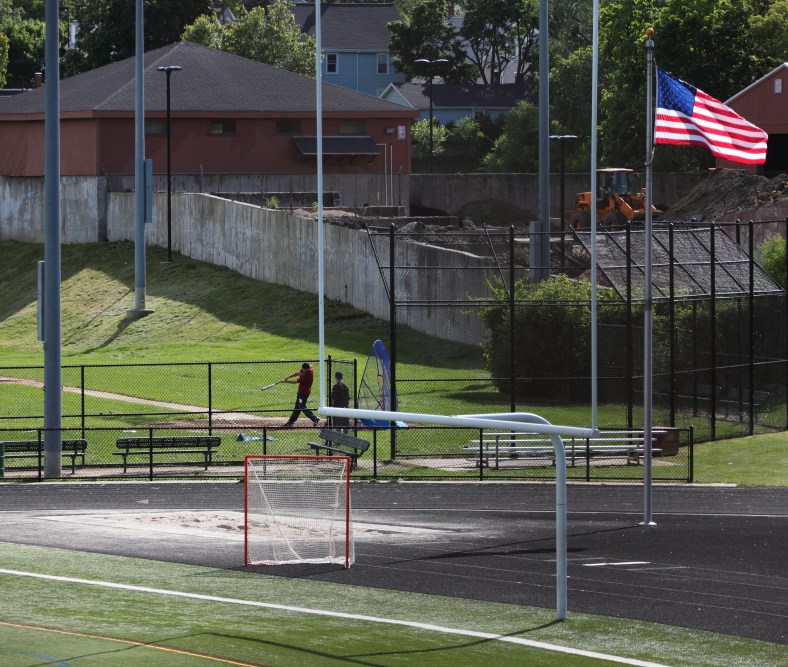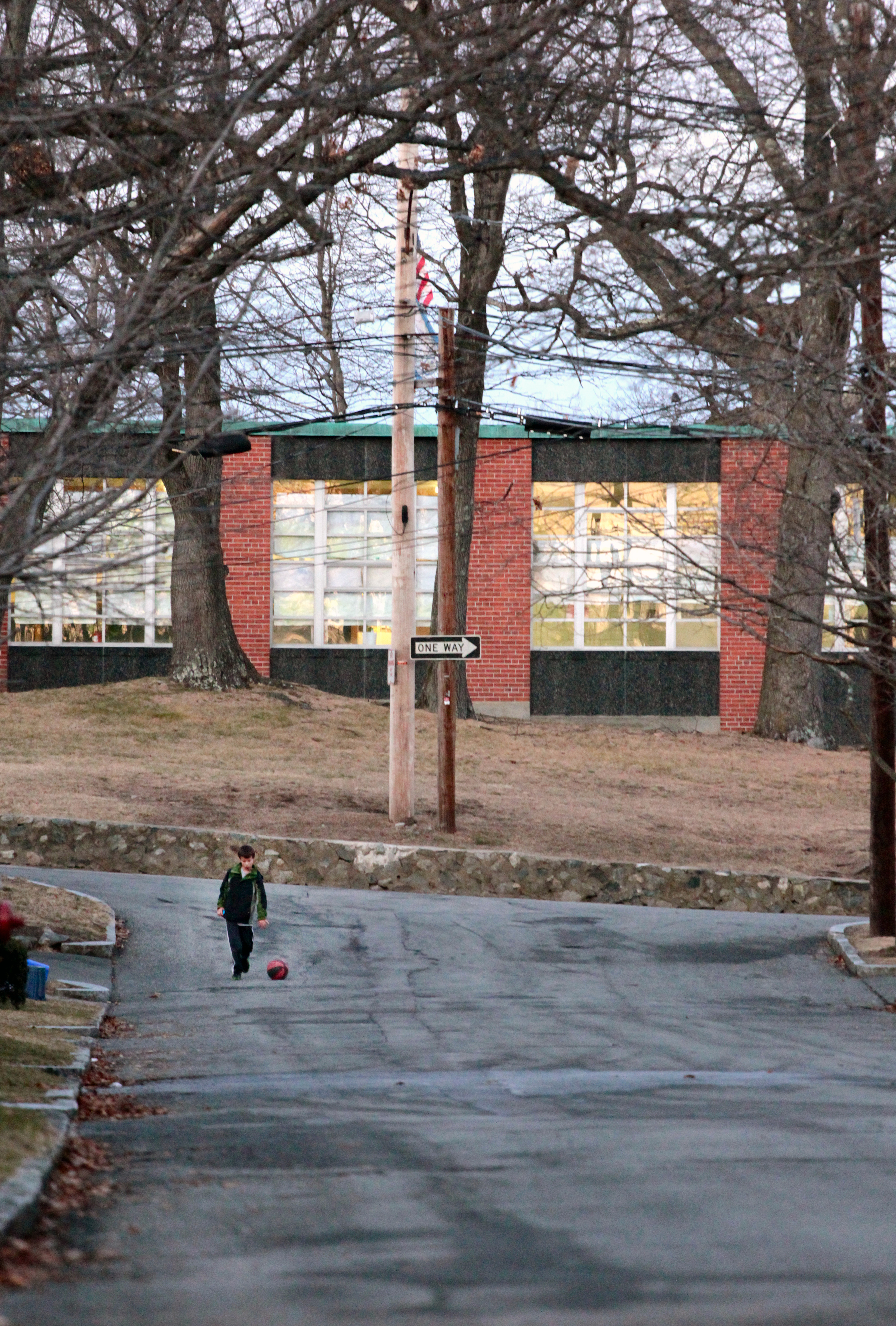 The M. Norcross Stratton Elementary school and its blacktop, playing field, and playground under a foreboding sky. July 21, 2010.