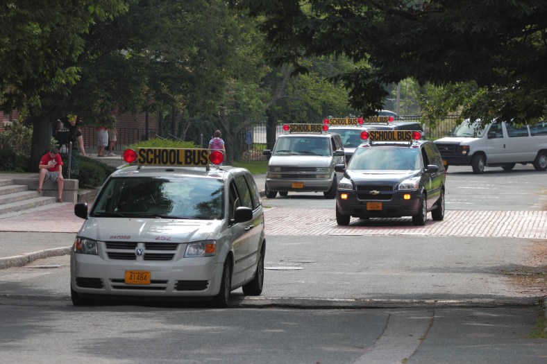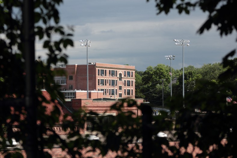 The Rodney J. Hardy Elementary School, one of the buildings seen exposed above the tree line, in an early spring view of Arlington from the Alewife Station parking garage. April 16, 2012.