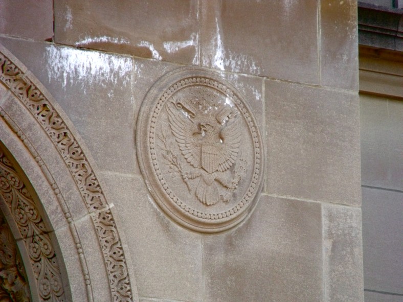 One of four seals decorating the façade of Arlington’s Town Hall. August 9, 2010.