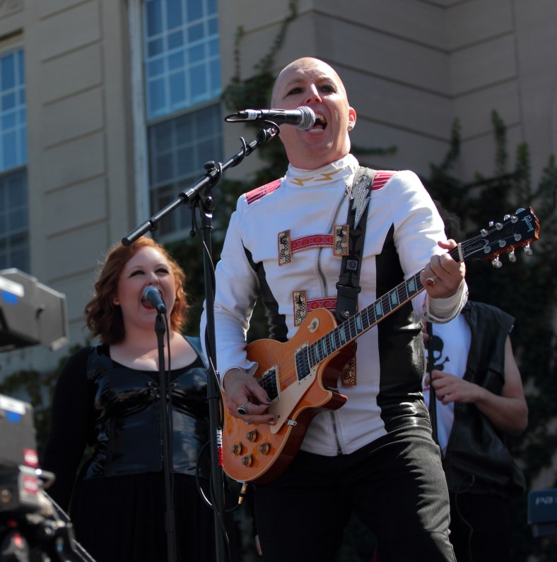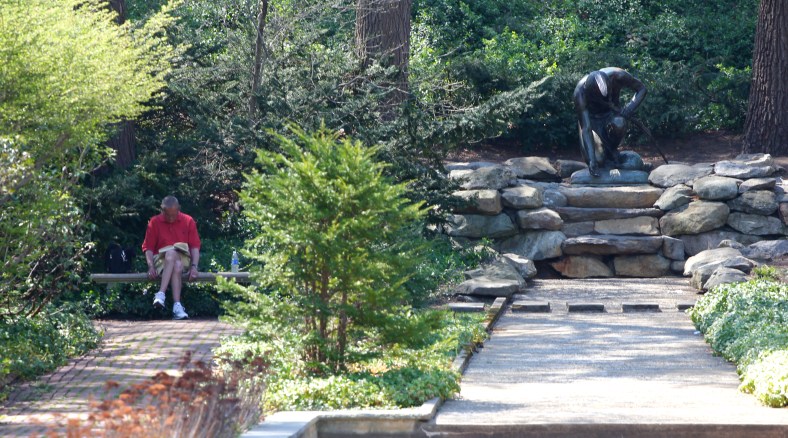 A mother and her children sit in the Town Hall garden opposite Cyrus E. Dallin’s “Menotomy Indian Hunter.” April 4, 2012.